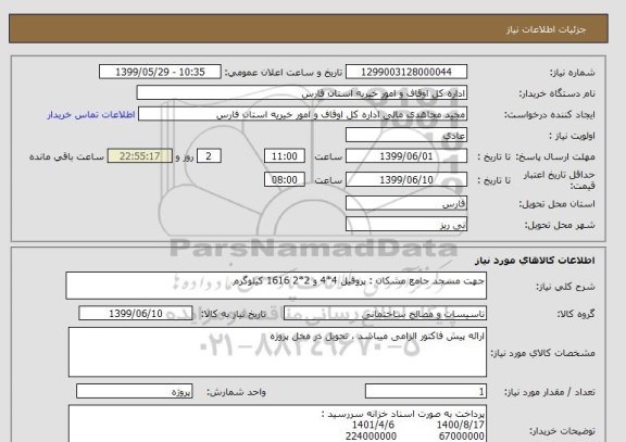 شرح کلی نیاز: جهت مسجد جامع مشکان : پروفیل 4*4 و 2*2 1616 کیلوگرم