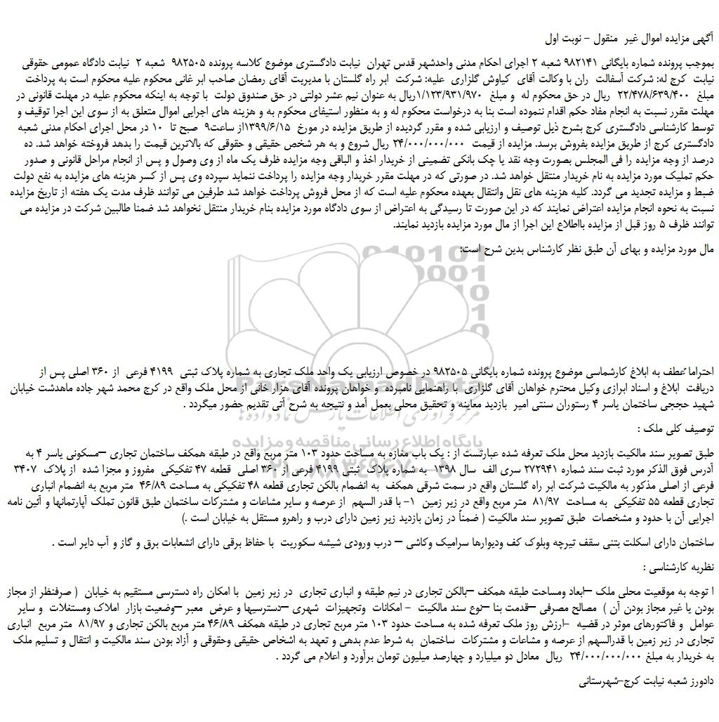 بموجب پرونده شماره بایگانی 982141 شعبه 2 اجرای احکام مدنی واحدشهر قدس تهران نیابت دادگستری موضوع کلاسه پرونده 982505 شعبه 2 نیابت دادگاه عمومی حقوقی نیابت کرج له: شرکت آسفالت ران با وکالت آقای کیاوش گلزاری علیه: شرکت ابر راه گلستان با مدیریت آقای رمضان صاحب ابر غانی محکوم علیه محکوم است به پرداخت مبلغ 22/478/639/400 ریال در حق محکوم له و مبلغ 1/123/931/970ریال به عنوان نیم عشر دولتی در حق صندوق دولت با توجه به اینکه محکوم علیه در مهلت قانونی در مهلت مقرر نسبت به انجام مفاد حکم اقدام ننموده است بنا به درخواست محکوم له و به منظور استیفای محکوم به و هزینه های اجرایی اموال متعلق به از سوی این اجرا توقیف و توسط کارشناسی دادگستری کرج بشرح ذیل توصیف و ارزیابی شده و مقرر گردیده از طریق مزایده در مورخ 1399/6/15از ساعت9 صبح تا 10 در محل اجرای احکام مدنی شعبه دادگستری کرج از طریق مزایده بفروش برسد. مزایده از قیمت 24/000/000/000 ریال شروع و به هر شخص حقیقی و حقوقی که بالاترین قیمت را بدهد فروخته خواهد شد. ده درصد از وجه مزایده را فی المجلس بصورت وجه نقد یا چک بانکی تضمینی از خریدار اخذ و الباقی وجه مزایده ظرف یک ماه از وی وصول و پس از انجام مراحل قانونی و صدور حکم تملیک مورد مزایده به نام خریدار منتقل خواهد شد. در صورتی که در مهلت مقرر خریدار وجه مزایده را پرداخت ننماید سپرده وی پس از کسر هزینه های مزایده به نفع دولت ضبط و مزایده تجدید می گردد. کلیه هزینه های نقل وانتقال بعهده محکوم علیه است که از محل فروش پرداخت خواهد شد طرفین می توانند ظرف مدت یک هفته از تاریخ مزایده نسبت به نحوه انجام مزایده اعتراض نمایند که در این صورت تا رسیدگی به اعتراض از سوی دادگاه مورد مزایده بنام خریدار منتقل نخواهد شد ضمنا طالبین شرکت در مزایده می توانند ظرف 5 روز قبل از مزایده بااطلاع این اجرا از مال مورد مزایده بازدید نمایند.