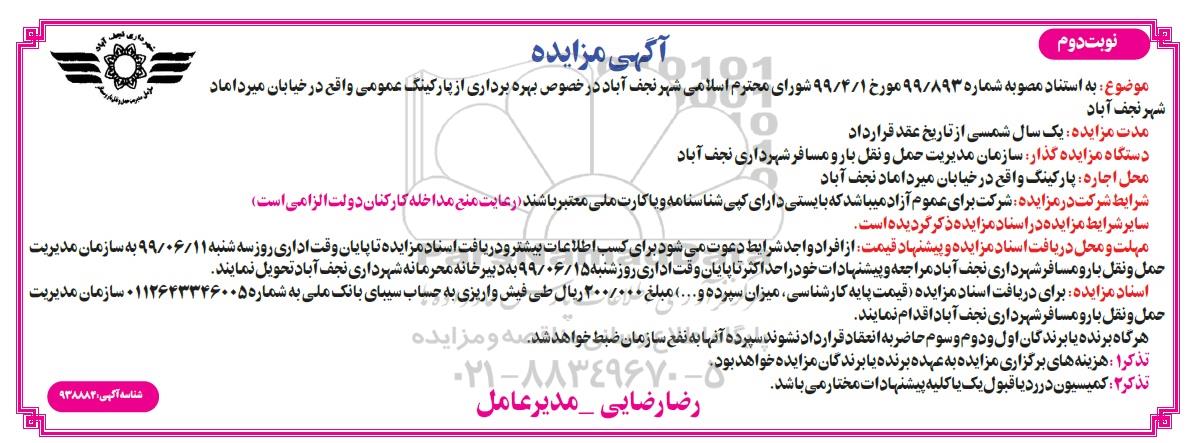 موضوع: در خصوص بهره برداری از پارکینگ عمومی واقع در خیابان میرداماد شهر نجف آباد