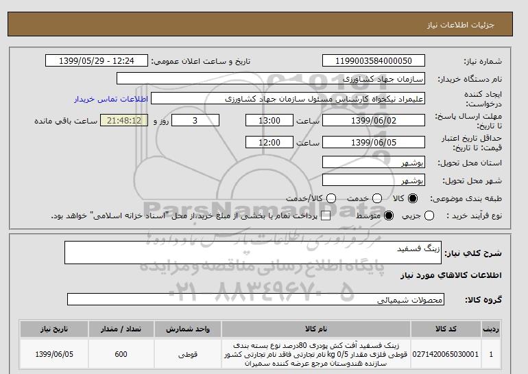 استعلام بها و موضوع استعلام استعلام زینگ فسفید به اطلاع کلیه شرکت‌ها و افراد متخصص واجد شرایط می‌رساند، آگهی گذار در نظر دارد از طریق استعلام بها، نسبت به انتخاب و دریافت پیشنهادات اقدام نماید. این استعلام با کد آگهی ثبت شده در سامانه خبرگزاری پارس نماد : 2637964 منتشر شده است. مشخصات استعلام : تاریخ شروع استعلام: 1399/05/29 آخرین مهلت ارسال پیشنهاد قیمت : 1399/06/01 و محل اجرای پروژه : استان مناقصات استان بوشهر میباشد. استعلام قیمت مورد درخواست : استعلام زینگ فسفید با دسته‌بندی‌های تخصصی و گروه های مرتبط : تجهیزات و خدمات کشاورزی و دامپروری, مواد شیمیایی, استعلام اطلاع رسانی میگردد.