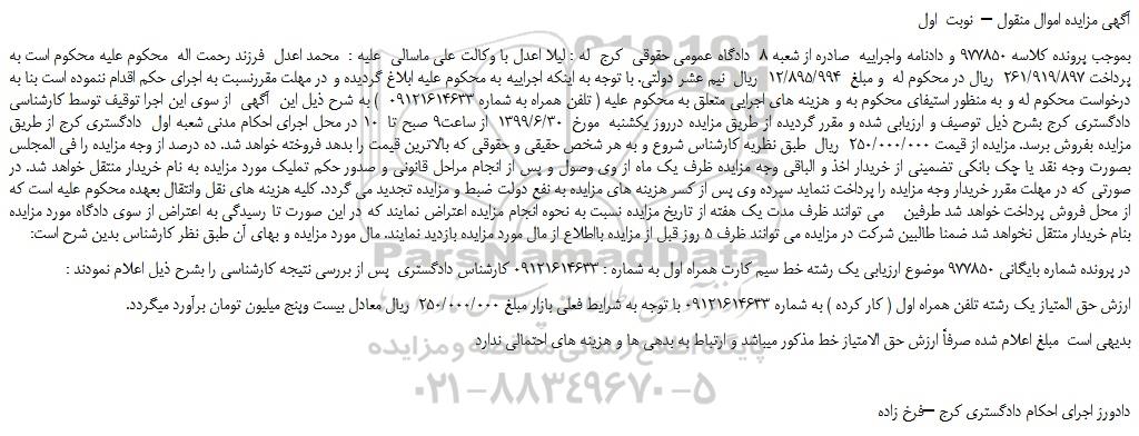 بموجب پرونده کلاسه 977850 و دادنامه واجراییه صادره از شعبه 8 دادگاه عمومی حقوقی کرج له : لیلا اعدل با وکالت علی ماسالی علیه : محمد اعدل فرزند رحمت اله محکوم علیه محکوم است به پرداخت 261/919/897 ریال در محکوم له و مبلغ 12/895/994 ریال نیم عشر دولتی. با توجه به اینکه اجراییه به محکوم علیه ابلاغ گردیده و در مهلت مقررنسبت به اجرای حکم اقدام ننموده است بنا به درخواست محکوم له و به منظور استیفای محکوم به و هزینه های اجرایی متعلق به محکوم علیه ( تلفن همراه به شماره 09121614633 ) به شرح ذیل این آگهی از سوی این اجرا توقیف توسط کارشناسی دادگستری کرج بشرح ذیل توصیف و ارزیابی شده و مقرر گردیده از طریق مزایده درروز یکشنبه مورخ 1399/6/30 از ساعت9 صبح تا 10 در محل اجرای احکام مدنی شعبه اول دادگستری کرج از طریق مزایده بفروش برسد. مزایده از قیمت 250/000/000 ریال طبق نظریه کارشناس شروع و به هر شخص حقیقی و حقوقی که بالاترین قیمت را بدهد فروخته خواهد شد. ده درصد از وجه مزایده را فی المجلس بصورت وجه نقد یا چک بانکی تضمینی از خریدار اخذ و الباقی وجه مزایده ظرف یک ماه از وی وصول و پس از انجام مراحل قانونی و صدور حکم تملیک مورد مزایده به نام خریدار منتقل خواهد شد. در صورتی که در مهلت مقرر خریدار وجه مزایده را پرداخت ننماید سپرده وی پس از کسر هزینه های مزایده به نفع دولت ضبط و مزایده تجدید می گردد. کلیه هزینه های نقل وانتقال بعهده محکوم علیه است که از محل فروش پرداخت خواهد شد طرفین می توانند ظرف مدت یک هفته از تاریخ مزایده نسبت به نحوه انجام مزایده اعتراض نمایند که در این صورت تا رسیدگی به اعتراض از سوی دادگاه مورد مزایده بنام خریدار منتقل نخواهد شد ضمنا طالبین شرکت در مزایده می توانند ظرف 5 روز قبل از مزایده بااطلاع از مال مورد مزایده بازدید نمایند. مال مورد مزایده و بهای آن طبق نظر کارشناس بدین شرح است: