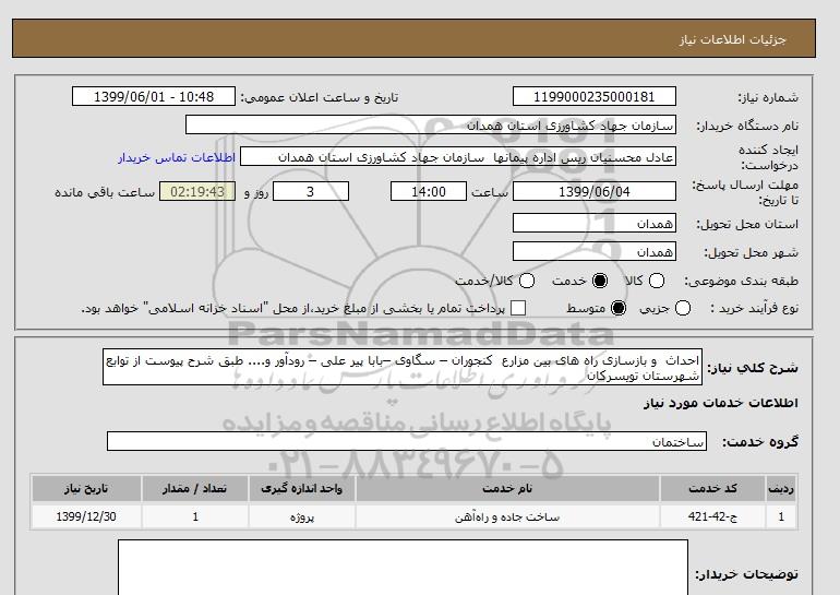 شرح کلی نیاز: احداث و بازسازی راه های بین مزارع کنجوران – سگاوی –بابا پیر علی – رودآور و.... طبق شرح پیوست از توابع شهرستان تویسرکان