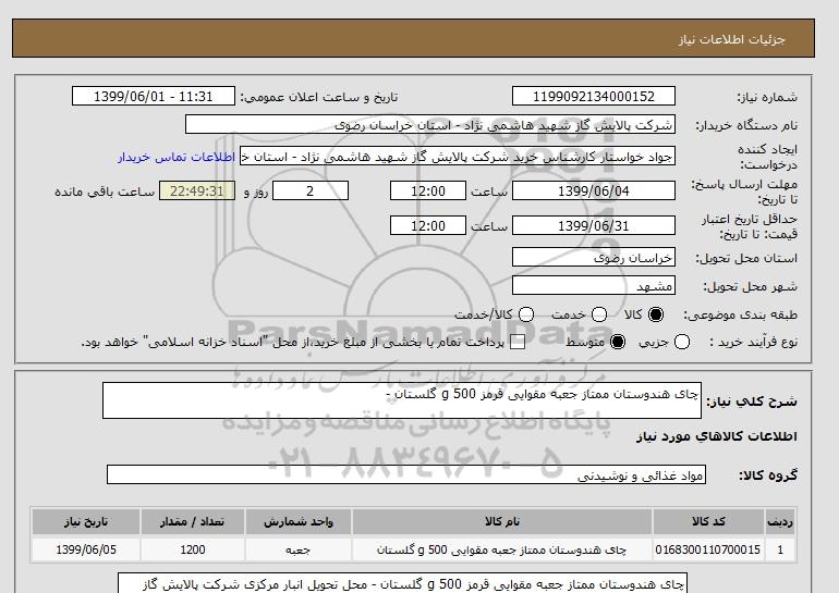 نام دستگاه خریدار:شرکت پالایش گاز شهید هاشمی نژاد - استان خراسان رضوی
