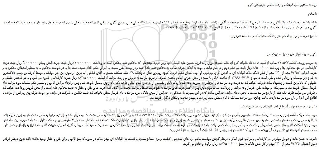 به موجب پرونده کلاسه971542 صادره از شعبه 8  دادگاه خانواده کرج لها خانم خدیجه نوری زاده فرزند حسین علیه قبلعلی آب برین فرزند سهندعلی که محکوم علیه محکوم است به پرداخت 170/000/000ریال بابت اجرت المثل ومبلغ 4/000/000 ریال بابت هزینه کارشناسی در حق محکوم لها و پرداخت 8/500/000 ریال بابت نیم عشر دولتی در حق دولت با توجه به اینکه اجرائیه صادره به محکوم علیه ابلاغ شده و در مهلت مقرر نسبت به اجرای حکم اقدام ننموده است بنا به در خواست محکوم له به منظور استیفای محکوم به و هزینه اجرایی 62/57 سهم از 240 سهم از شش دانگ ملک قولنامه ای به آدرس کرج، مهرشهر، آق تپه، خیابان ششم غربی، کوچه روبروی عدل 2، پلاک 29، طبقه همکف متعلق به آقای قبلعلی آب برین  از سوی این اجرا توقیف و توسط کارشناس رسمی دادگستری به شرح زیر توصیف و ارزیابی شده و مقرر است در مورخ  1399/06/16  از ساعت 8 الی 9 صبح در محل اجرای احکام مجتمع خانواده از طریق مزایده به فروش می رسد، مزایده از قیمت 182/500/000 ریال نظریه کارشناسی  شروع می شود و به هر شخص حقیقی و حقوقی که بالاترین قیمت را پیشنهاد نماید فروخته خواهد شد ده درصد وجه مزایده فی المجلس به صورت وجه نقد یا چک بانکی تضمینی از خریدار اخذ و الباقی ظرف یک ماه از وی وصول خواهد شد و پس از انجام مراحل قانونی و صدور حکم تملیک مورد مزایده بنام خریدار منتقل خواهد شد در صورتیکه در مهلت مقرر خریدار وجه مزایده را پرداخت ننماید سپرده وی پس از کسر هزینه های مزایده به نفع دولت ضبط و مزایده تجدید می گردد کلیه هزینه های نقل و انتقال به عهده محکوم علیه است و از محل فروش پرداخت خواهد شد . طرفین می توانند ظرف یک هفته از تاریخ مزایده نسبت به نحوه انجام مزایده اعتراض نمایند که در این صورت تا رسیدگی به اعتراض از سوی دادگاه مورد مزایده به نام خریدار منتقل نخواهد شد ضمنا طالبین به شرکت در مزایده می توانند ظرف پنج روز قبل از مزایده با اطلاع این اجرا از مال مورد مزایده بازدید نمایند چنانچه روز مزایده مصادف با ایام تعطیل باشد روز بعد در همان ساعت و مکان برگزار خواهد شد .