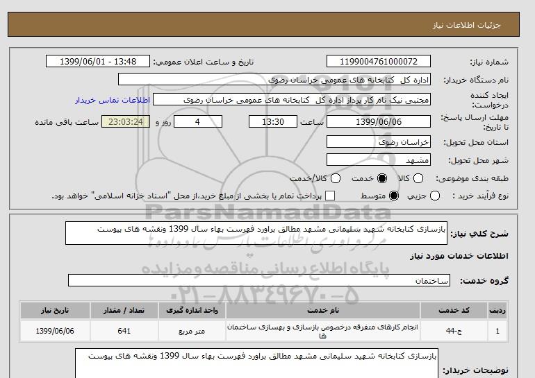 توضیحات خریداربازسازی کتابخانه شهید سلیمانی مشهد مطالق براورد فهرست بهاء سال 1399 ونقشه های پیوست