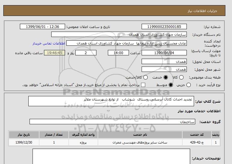 شرح کلی نیاز: تجدید احداث کانال آبرسانی روستای شوشاب از توابع شهرستان ملایر