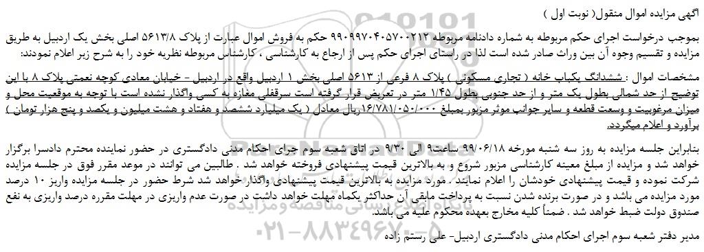 بموجب درخواست اجرای حکم مربوطه به شماره دادنامه مربوطه 9909970405700212 حکم به فروش اموال عبارت از پلاک 5613/8 اصلی بخش یک اردبیل به طریق مزایده و تقسیم وجوه آن بین وراث صادر شده است لذا در راستای اجرای حکم پس از ارجاع به کارشناسی ، کارشناس مربوطه نظریه خود را به شرح زیر اعلام نمودند: