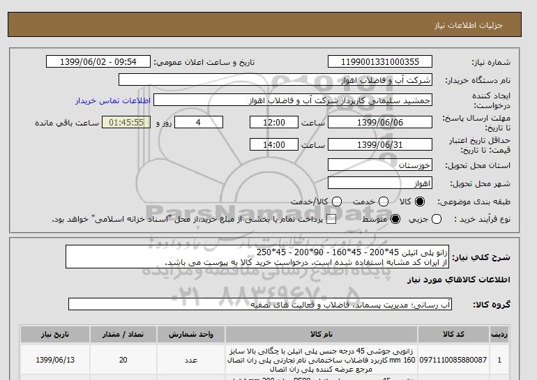 شرح کلی نیاز: زانو پلی اتیلن 45*200 - 45*160 - 90*200 - 45*250