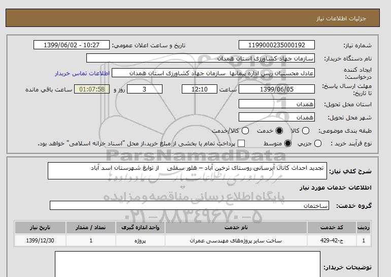 شرح کلی نیاز: تجدید احداث کانال آبرسانی روستای ترخین آباد – هلور سفلی از توابع شهرستان اسد آباد