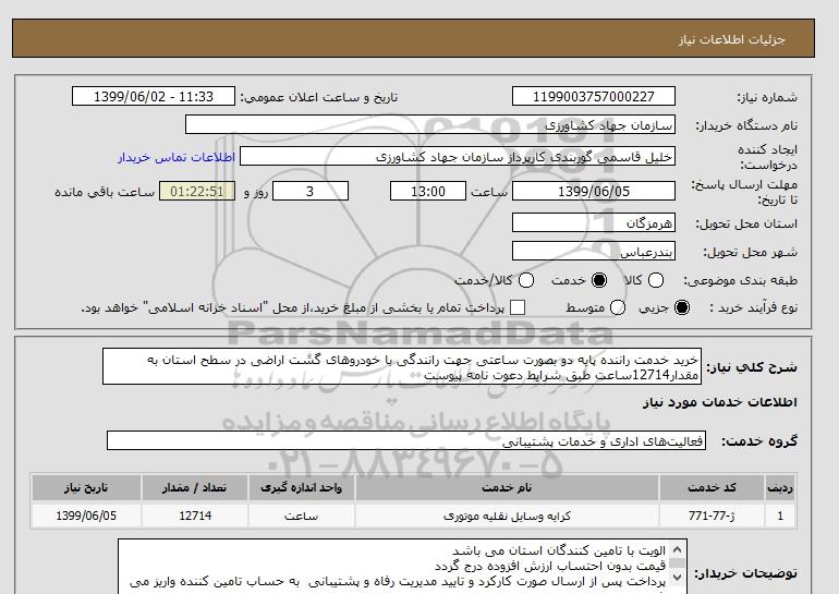 شرح کلی نیاز: خرید خدمت راننده پایه دو بصورت ساعتی جهت رانندگی با خودروهای گشت اراضی در سطح استان به مقدار12714ساعت طبق شرایط دعوت نامه پیوست