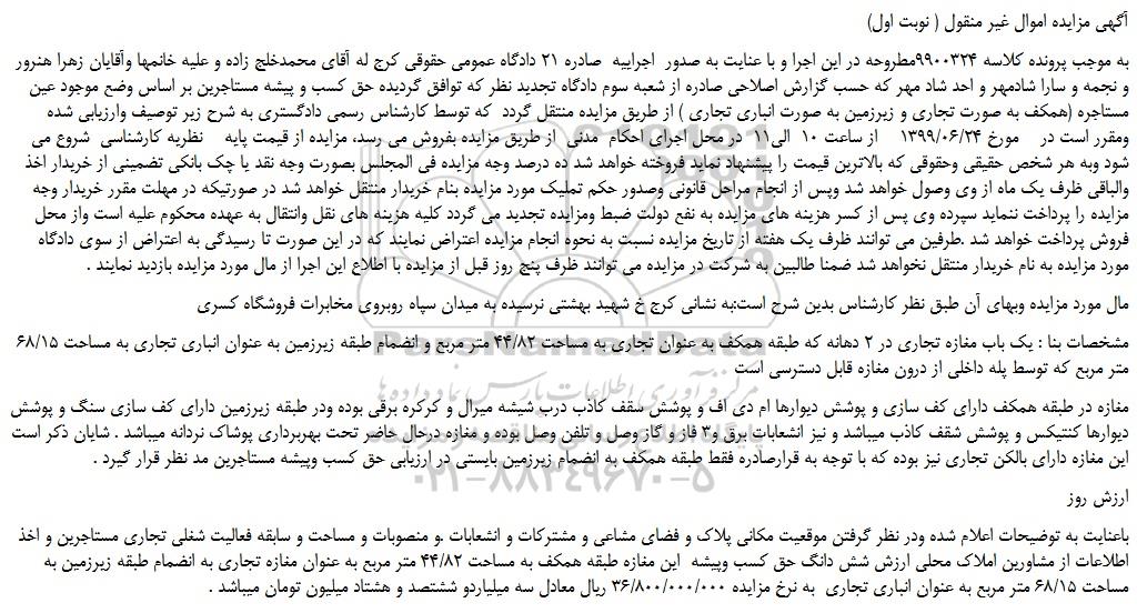 به موجب پرونده کلاسه 9900324مطروحه در این اجرا و با عنایت به صدور اجراییه صادره 21 دادگاه عمومی حقوقی کرج له آقای محمدخلج زاده و علیه خانمها وآقایان زهرا هنرور و نجمه و سارا شادمهر و احد شاد مهر که حسب گزارش اصلاحی صادره از شعبه سوم دادگاه تجدید نظر که توافق گردیده حق کسب و پیشه مستاجرین بر اساس وضع موجود عین مستاجره (همکف به صورت تجاری و زیرزمین به صورت انباری تجاری ) از طریق مزایده منتقل گردد که توسط کارشناس رسمی دادگستری به شرح زیر توصیف وارزیابی شده ومقرر است در مورخ 1399/06/24 از ساعت 10 الی11 در محل اجرای احکام مدنی از طریق مزایده بفروش می رسد، مزایده از قیمت پایه نظریه کارشناسی شروع می شود وبه هر شخص حقیقی وحقوقی که بالاترین قیمت را پیشنهاد نماید فروخته خواهد شد ده درصد وجه مزایده فی المجلس بصورت وجه نقد یا چک بانکی تضمینی از خریدار اخذ والباقی ظرف یک ماه از وی وصول خواهد شد وپس از انجام مراحل قانونی وصدور حکم تملیک مورد مزایده بنام خریدار منتقل خواهد شد در صورتیکه در مهلت مقرر خریدار وجه مزایده را پرداخت ننماید سپرده وی پس از کسر هزینه های مزایده به نفع دولت ضبط ومزایده تجدید می گردد کلیه هزینه های نقل وانتقال به عهده محکوم علیه است واز محل فروش پرداخت خواهد شد .طرفین می توانند ظرف یک هفته از تاریخ مزایده نسبت به نحوه انجام مزایده اعتراض نمایند که در این صورت تا رسیدگی به اعتراض از سوی دادگاه مورد مزایده به نام خریدار منتقل نخواهد شد ضمنا طالبین به شرکت در مزایده می توانند ظرف پنج روز قبل از مزایده با اطلاع این اجرا از مال مورد مزایده بازدید نمایند .