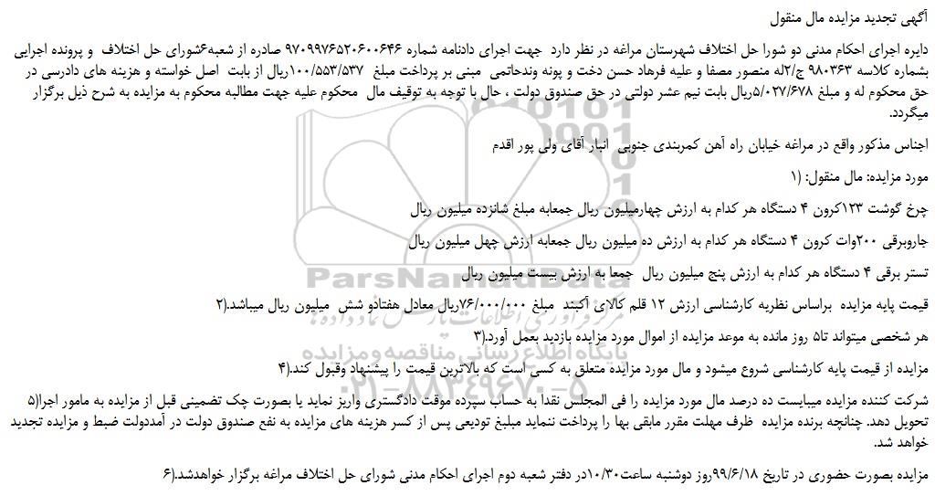 آگهی تجدید مزایده مال منقول