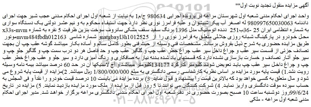 واحد اجرای احکام مدنی شعبه اول شهرستان مراغه در پرونده اجرایی 980634 ج/م1 به نیابت از شعبه اول اجرای احکام مدنی عجب شیر جهت اجرای دادنامه 980997650030063 له اصغر آب پیکر شیشوان و علیه فرامرز نوری نظر دارد جهت استیفاء محکوم به و نیم عشر دولتی یک دستگاه سواری x33s-mvm به شماره انتظامی ایران 25 -36ب251 دنده اتوماتیک مدل 1396 برنگ سفید سقف مشکی سانروف سوخت بنزین ظرفیت 5 نفره به شماره موتور mvm484fbdh012163 و شماره شاسی natgbayl3h1012525 محل خودرو در پارکینگ شبانه روزی جلالی متعلق به فرامرز نوری را از طریق مزایده حضوری به شرح ذیل بفروش برساند. مشخصات فنی وسیله از حیث فنی بطور کامل سالم و آماده بکار میباشد گوشه عقب چپ آن بجهت تصادف جزئی از قسمت سپر عقب و چراغ داخل سپر عقب چراغ خطر عقب چپ و گلگیر عقب چپ و حد فاصل هر دو درب سمت چپ و گلگیر جلو چپ و سپر جلو آثار تصادف و خسارت بازسازی نشده دارد که قسمتهای یاد شده بدنه نیاز به صافکاری و رنگ آمیزی دارد و سپر جلو و عقب چراغ خطر عقب چپ و چراغ داخل سپر عقب چپ باید تعویض شوند کلیومتر کارکرد 134177کلیومتر میباشد و آج لاستیکها آن در حد 60 درصد میباشد بیمه نامه وسیله رویت نشد.1) قیمت پایه مورد مزایده بر اساس نظریه کارشناسی رسمی دادگستری به مبلغ 1/800/000/000 ریال میباشد. 2)مزایده از قیمت پایه شروع می شود و مال متعلق به کسی خواهد بود که بالاترین قیمت را پیشنهاد و قبول نماید. 3) برنده مزایده می بایست 10 درصد قیمت خودرو را نقداً و فی المجلس به حساب سپرده موقت دادگستری واریز نماید. 4) شرکت کنندگان می توانند تا 5 روز قبل از مزایده از ملک مورد مزایده بازدید نمایند. 5) مزایده در تاریخ 99/6/24روز دوشنبه ساعت 10 صبح بصورت حضوری در دفترشعبه اول اجرای احکام مدنی دادگستری مراغه برگزار خواهد شد. مدیر اجرای احکام مدنی شعبه اول مراغه - ملکی