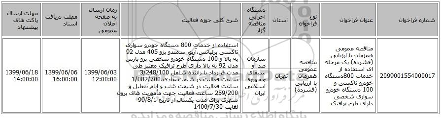 2099001554000017مناقصه عمومی همزمان با ارزیابی (فشرده) یک مرحله ای استفاده از خدمات 800دستگاه خودرو تاکسی و 100 دستگاه خودرو سواری شخصی دارای طرح ترافیکمناقصه عمومی همزمان با ارزیابی (فشرده)تهرانسازمان صدا و سیمای جمهوری اسلامی ایراناستفاده از خدمات 800 دستگاه خودرو سواری تاکسی برلیانس،آریو، سمندو پژو 405 مدل 92 به بالا و 100 دستگاه خودرو شخصی پژو پارس مدل 92 به بالا دارای طرح ترافیک معتبر طی مدت قرارداد با راننده شامل 3/248/100 ساعت فعالیت در شیفت عادی،1/082/700 ساعت فعالیت در شیفت شب و ایام تعطیل و 259/200 ساعت فعالیت جهت مأموریت های برون شهری برای مدت یکسال از تاریخ 99/8/1 لغایت 1400/7/30 1399/06/03 12:00:001399/06/06 16:00:001399/06/18 14:00:00