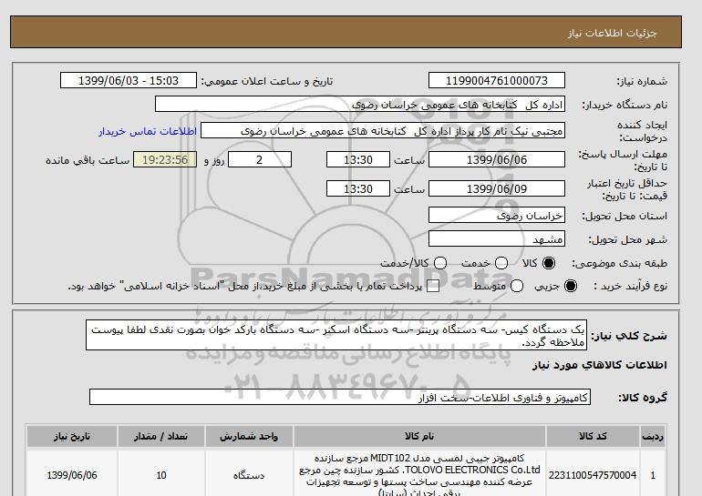 استعلام یک دستگاه کیس- سه دستگاه پرینتر -سه دستگاه اسکنر -سه دستگاه بارکد خوان بصورت نقدی لطفا پیوست ملاحظه گردد., استعلام یک دستگاه کیس- سه دستگاه پرینتر -سه دستگاه اسکنر -سه دستگاه بارکد خوان بصورت نقدی لطفا پیوست ملاحظه گردد.