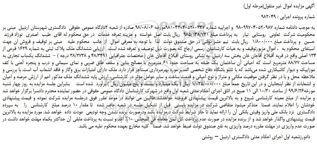به موجب دادنامه شماره 980997040520987 و اجراییه شماره 9810420405200347مورخه 98/08/06 صادره از شعبه 2دادگاه عمومی حقوقی دادگستری شهرستان اردبیل مبنی بر محکومیت شرکت تعاونی روستایی نیار به پرداخت مبلغ 985/148/721 ریال بابت اصل خواسته و هزینه تعرفه خدمات در حق محکوم له اقای طیب اصغری نوزاد فرزند حسین و پرداخت مبلغ 1/800/000 ریال بابت نیم عشر دولتی در حق صندوق دولت لذا با توجه به معرفی اموال از جانب محکوم علیه مبنی بر توقیف و فروش ان جهت اسیتفای محکوم به ، اموال مزبورتوقیف و به هیات کارشناسان رسمی ارجاع که بصورت ذیل توصیف و تعرفه شده است. ارزیابی ششدانگ ملک پلاک ثبتی به شماره 1629 فرعی از 134 اصلی واقع در قریه آقبلاغ آقاجان خان بخش سه اردبیل به نشانی روستای آقبلاغ آقاجان خان ( مختصات جغرافیایی 48/3491 و 38/2738 درجه ) - ششدانگ یک باب تجاری به مساحت 88/77 مترمربع است که اعیانی آن ساختمان یک طبقه به مساحت حدود 61 مترمربع با مصالح بنایی و سقف طاق ضربی و نمای سیمانی و درب و پنجره آهنی با کف موزاییک و دیوار کاشیکاری شده می باشد که با تابلو باشگاه دفاع شخصی الغدیر مورد بهره برداری مستاجر قرار دارد. ملک دارای امتیازات برق وگاز و فاقد انشعاب آب است. با بررسی و ملاحظه محل و با در نظر گرفتن موقعیت مکانی و متراژ و نوع اعیانی و قدمت ساخت و سایر عوامل مؤثر در کارشناسی، ارزش پایه ششدانگ ملک مذکور اعم از ارزش عرصه و اعیان و انشعابات از نظر اینجانبان و در این تاریخ جمعاً مبلغ 1/025/000/000 ریال ( یک میلیارد و بیست و پنج میلیون ریال ) برآورد شده است بنابراین جلسه مزایده به روز چهار شنبه مورخه99/6/26 از ساعت 10/30 الی 11 صبح در اتاق اجرای احکام مدنی شعبه اول واقع در شهرک کارشناسان دادگاه عمومی حقوقی در حضور نماینده محترم دادسرا برگزار خواهد شد و مزایده از مبلغ معینه کارشناسی شروع و به بالاترین قیمت پیشنهادی فروخته خواهدشد..طالبین می توانند در موعد مقرر فوق درجلسه مزایده شرکت نموده و قیمت پیشنهادی خودشان را اعلام نمایند. ضمنا متذکر میشود متقاضی شرکت در مزایده بایستی قبل از تشکیل جلسه در شعبه حاضر شده تا مقدار 10 درصد مبلغ کارشناسی را به سپرده دادگستری نزد بانک ملی واریز وفیش بانکی آن را ارائه نماید تا حائز شرایط شرکت درمزایده باشد ودرصورت برنده نشدن وجه تودیعی عودت داده خواهد شد. مورد مزایده به بالاترین قیمت پیشنهادی واگذار خواهد شد و از برنده مزایده در صورت عدم پرداخت کل ثمن معامله فی المجلس 10% اخذ و نسبت به پرداخت مابقی آن حداکثر یکماه مهلت خواهد داشت در صورت عدم واریزی در مهلت مقرره درصد واریزی به نفع صندوق دولت ضبط خواهد شد. ضمنا" کلیه مخارج بعهده محکوم علیه می باشد.
