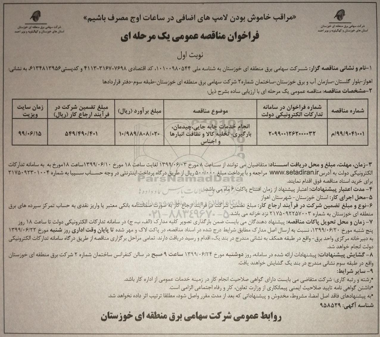 فراخوان مناقصه انجام خدمات جابه جایی، چیدمان، بارگیری از کلیه افراد متخصص و شرکتها واجد شرایط دعوت به عمل میآید در مناقصه با کد خبرگزاری پارس نماد: 2653465 شرکت نمایند.