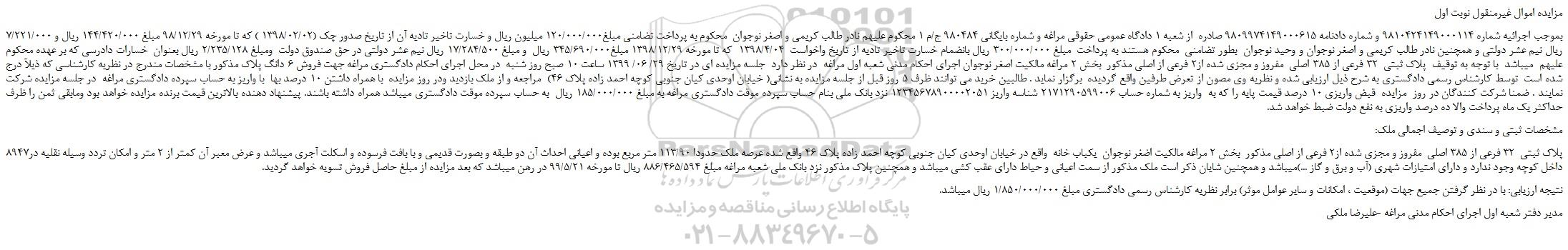 بموجب اجرائیه شماره 9810424149000114 و شماره دادنامه 9809974149000615 صادره از شعبه 1 دادگاه عمومی حقوقی مراغه و شماره بایگانی 980484 ج/م 1 محکوم علیهم نادر طالب کریمی و اصغر نوجوان محکوم به پرداخت تضامنی مبلغ120/000/000 میلیون ریال و خسارت تاخیر تادیه آن از تاریخ صدور چک (1398/02/02 ) که تا مورخه 98/12/29 مبلغ 144/420/000 ریال و 7/221/000 ریال نیم عشر دولتی و همچنین نادر طالب کریمی و اصغر نوجوان و وحید نوجوان بطور تضامنی محکوم هستند به پرداخت مبلغ 300/000/000 ریال بانضمام خسارت تاخیر تادیه از تاریخ واخواست 1398/4/04 که تا مورخه 1398/12/29 مبلغ345/690/000 ریال و مبلغ 17/284/500 ریال نیم عشر دولتی در حق صندوق دولت ومبلغ 2/235/128 ریال بعنوان خسارات دادرسی که بر عهده محکوم علیهم میباشد با توجه به توقیف پلاک ثبتی 32 فرعی از 385 اصلی مفروز و مجزی شده از2 فرعی از اصلی مذکور بخش 2 مراغه مالکیت اصغر نوجوان اجرای احکام مدنی شعبه اول مراغه در نظر دارد جلسه مزایده ای در تاریخ 29/ 06/ 1399 ساعت 10 صبح روز شنبه در محل اجرای احکام دادگستری مراغه جهت فروش 6 دانگ پلاک مذکور با مشخصات مندرج در نظریه کارشناسی که ذیلآ درج شده است توسط کارشناس رسمی دادگستری به شرح ذیل ارزیابی شده و نظریه وی مصون از تعرض طرفین واقع گردیده برگزار نماید . طالبین خرید می توانند ظرف 5 روز قبل از جلسه مزایده به نشانی( خیابان اوحدی کیان جنوبی کوچه احمد زاده پلاک 46) مراجعه و از ملک بازدید ودر روز مزایده با همراه داشتن 10 درصد بها با واریز به حساب سپرده دادگستری مراغه در جلسه مزایده شرکت نمایند . ضمنا شرکت کنندگان در روز مزایده قبض واریزی 10 درصد قیمت پایه را که به واریز به شماره حساب 2171290599006 شناسه واریز 12345678900002051 نزد بانک ملی بنام حساب سپرده موقت دادگستری مراغه به مبلغ 185/000/000 ریال به حساب سپرده موقت دادگستری میباشد همراه داشته باشند. پیشنهاد دهنده بالاترین قیمت برنده مزایده خواهد بود ومابقی ثمن را ظرف حداکثر یک ماه پرداخت والا ده درصد واریزی به نفع دولت ضبط خواهد شد.