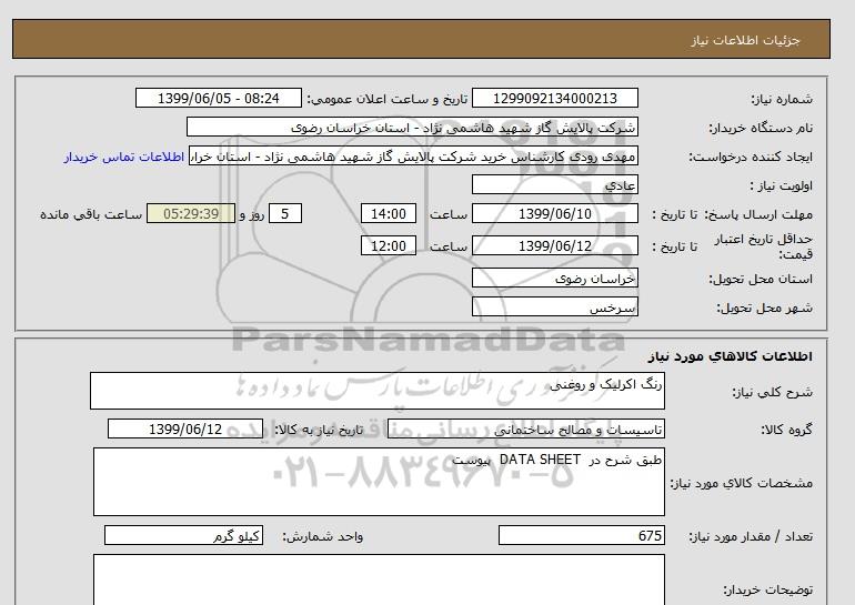 نام دستگاه خریدار:شرکت پالایش گاز شهید هاشمی نژاد - استان خراسان رضوی