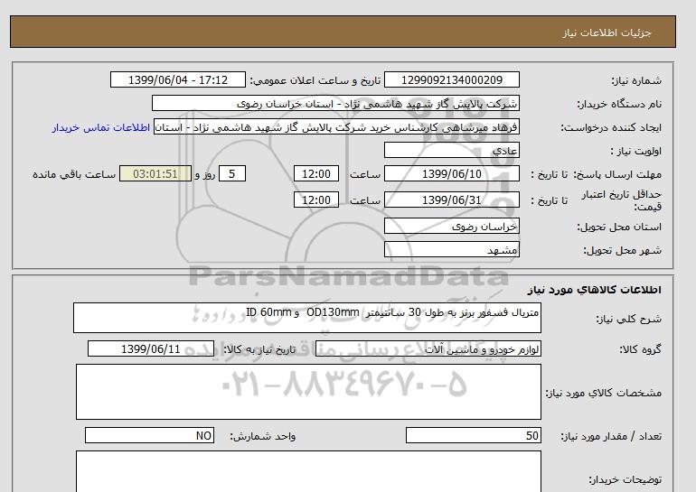 نام دستگاه خریدار:شرکت پالایش گاز شهید هاشمی نژاد - استان خراسان رضوی