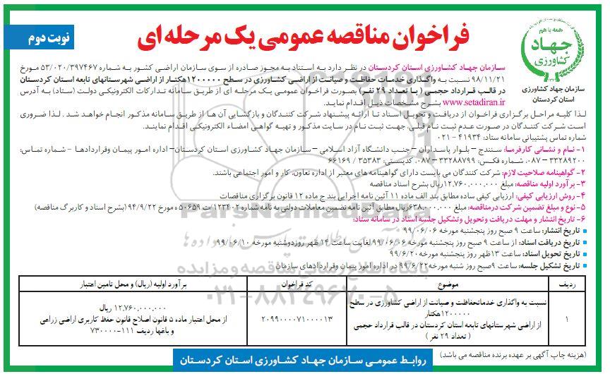 سازمان جهاد کشاورزی استان کردستان در نظر دارد نسبت به واگذاری خدمات حفاظت و صیانت از اراضی کشاورزی در سطح 1200000 هکتار از اراضی شهرستان های تابعه استان کردستان در قالب قرارداد حجمی (با تعداد 29 نفر) به صورت فراخوان عمومی یک مرحله ای از طریق سامانه تدارکات الکترونیکی دولت ستاد به آدرس ستاد ایران به شرح مشخصات ذیل