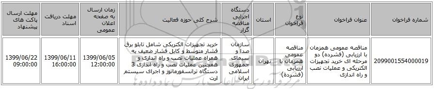 | 2099001554000019 | مناقصه عمومی همزمان با ارزیابی (فشرده) دو مرحله ای خرید تجهیزات الکتریکی و عملیات نصب و راه اندازی | مناقصه عمومی همزمان با ارزیابی (فشرده) | تهران | سازمان صدا و سیمای جمهوری اسلامی ایران | خرید تجهیزات الکتریکی شامل تابلو برق فشار متوسط و کابل فشار ضعیف به همراه عملیات نصب و راه اندازی و همچنین عملیات نصب و راه اندازی 3 دستگاه ترانسفورماتور و اجرای سیستم ارت | 1399/06/05 12:00:00 | 1399/06/11 16:00:00 | 1399/06/22 09:00:00 |