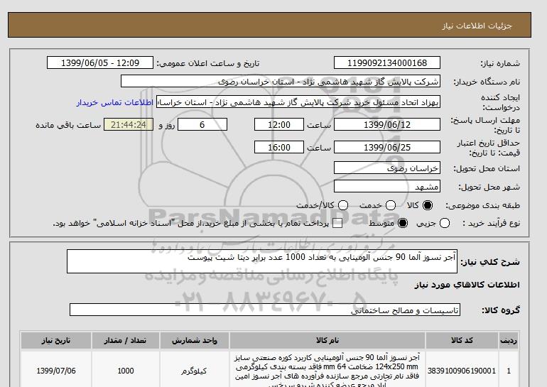 نام دستگاه خریدار:شرکت پالایش گاز شهید هاشمی نژاد - استان خراسان رضوی