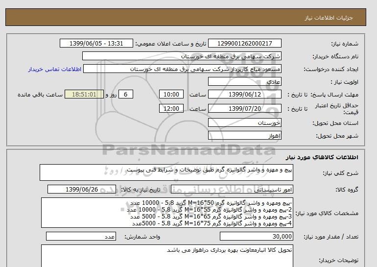 شرح کلی نیاز: پیچ و مهره و واشر گالوانیزه گرم طبق توضیحات و شرایط فنی پیوست