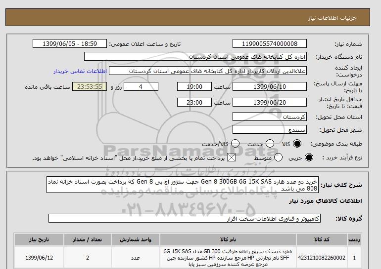 شرح کلی نیاز: خرید دو عدد هارد Gen 8 300GB 6G 15K SAS جهت سرور اچ پی Gen 8 که پرداخت بصورت اسناد خزانه نماد 808 می باشد