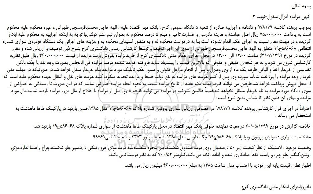بموجب پرونده کلاسه 978179 و دادنامه و اجراییه صادره از شعبه 5 دادگاه عمومی کرج : بانک مهر اقتصاد علیه : الهه حاجی محمدباقرمسچی طهرانی و غیره محکوم علیه محکوم است به پرداخت 75،000،000 ریال اصل خواسته و هزینه دادرسی و خسارت تاخیر و مبلغ 5 درصد محکوم به بعنوان نیم عشر دولتی،با توجه به اینکه اجراییه به محکوم علیه ابلاغ گردیده و در مهلت مقرر نسبت به اجرای حکم اقدام ننموده است بنا به درخواست محکوم له و به منظور استیفای محکوم به و هزینه های اجرائی یک دستگاه خودروی سواری شماره انتظامی 68-586ج19 متعلق به الهه حاجی محمدباقرمسچی طهرانی از سوی این اجرا توقیف و توسط کارشناس رسمی دادگستری کرج بشرح ذیل توصیف و ارزیابی شده و مقرر گردیده در مورخ 3/07/1399از ساعت 12:00 الی 13:00 در محل اجرای احکام مدنی دادگستری کرج از طریقمزایده بفروش برسد.مزایده از قیمت 460،000،000 ریال طبق نظریه کارشناسی شروع می شود و به هر شخص حقیقی و حقوقی که بالاترین قیمت را پیشنهاد نماید فروخته خواهد شد.ده درصد مزایده فی المجلس بصورت وجه نقد یا چک بانکی تضمینی از خریدار اخذ و الباقی ظرف یک ماه از وی وصول و پس از انجام مراحل قانونی و صدور حکم تملیک مورد مزایده بنام خریدار منقل خواهد شد.در صورتیکه در مهلت مقرر خریدار وجه مزایده را پرداخت ننماید سپرده وی پس از کسر هزینه های مزایده به نفع دولت ضبط و مزایده تجدید میگردد.کلیه هزینه های نقل و انتقال بعهده محکوم علیه است که از محل فروش پرداخت خواهد شد.طرفین می توانند ظرف مدت یک هفته از تاریخ مزایده نسبت به نحوه انجام مزایده اعتراض نمایند که در این صورت تا رسیدگی به اعتراض از سوی دادگاه مورد مزایده به نام خریدار منتقل نخواهد شد.ضمناً طالبین بشرکت در مزایده می توانند ظرف 5 روز قبل از مزایده با اطلاع از مال مورد مزایده بازدید نمایند.مال مورد مزایده و بهای آن طبق نظر کارشناس بدین شرح است :