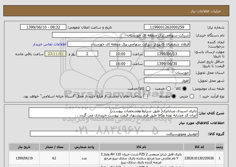 شرح کلی نیاز: باتری اسیدی صباباتری( طبق شرایط ومشخصات پیوست)