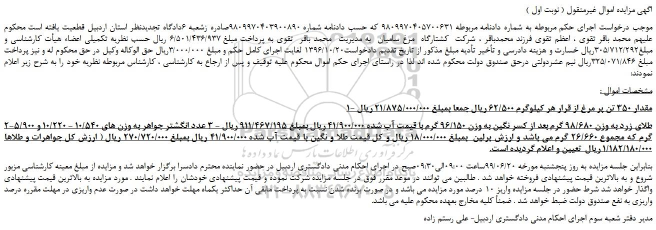 موجب درخواست اجرای حکم مربوطه به شماره دادنامه مربوطه 9809970405700631 که حسب دادنامه شماره 9809970403900890صادره زشعبه 6دادگاه تجدیدنظر استان اردبیل قطعیت یافته است محکوم علیهم محمد باقر تقوی ، اعظم تقوی فرزند محمدباقر ، شرکت  کشتارگاه  مرغ سامیان  به مدیریت  محمد باقر  تقوی به پرداخت مبلغ 6/501/436/937 ریال حسب نظریه تکمیلی اعضاء هیأت کارشناسی و مبلغ305/712/292ریال خسارت و هزینه دادرسی و تأخیر تأدیه مبلغ مذکور از تاریخ تقدیم دادخواست1396/10/20 لغایت اجرای کامل حکم و مبلغ 3/000/000ریال حق الوکاله وکیل در حق محکوم له و نیز پرداخت مبلغ 325/071/846ریال نیم عشردولتی درحق صندوق دولت محکوم شده اند لذا در راستای اجرای حکم اموال محکوم علیه توقیف و پس از ارجاع به کارشناسی ، کارشناس مربوطه نظریه خود را به شرح زیر اعلام نمودند: