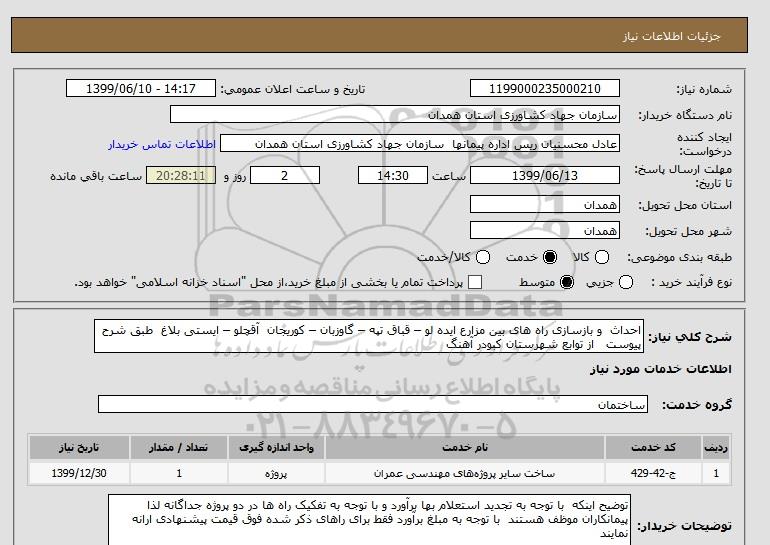 شرح کلی نیاز: احداث و بازسازی راه های بین مزارع ایده لو – قباق تپه – گاوزبان – کوریجان آقچلو – ایستی بلاغ طبق شرح پیوست از توابع شهرستان کبودر آهنگ