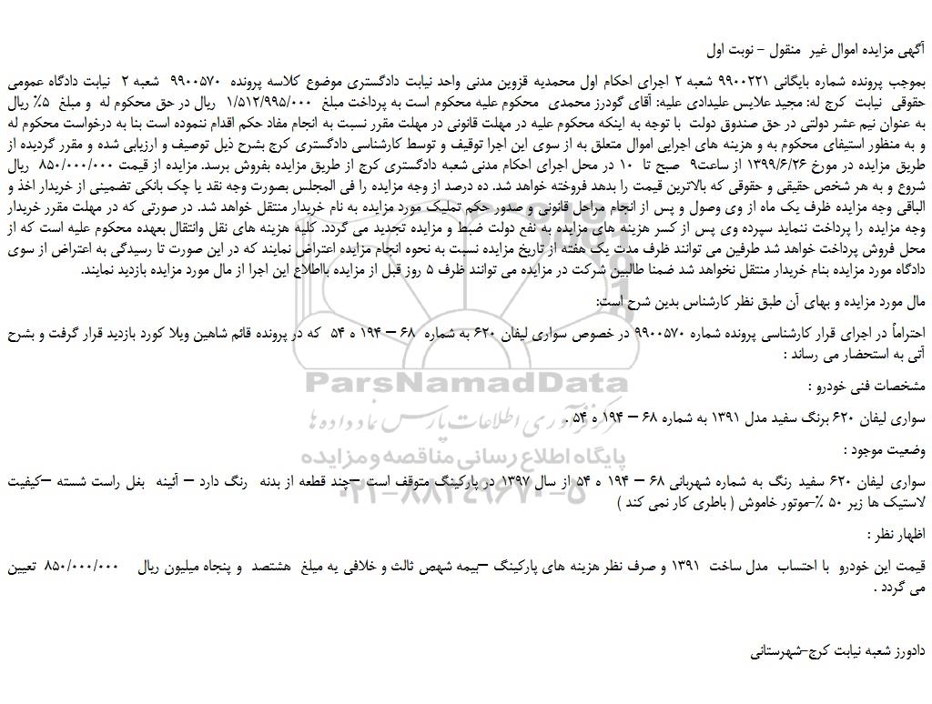احتراماً در اجرای قرار کارشناسی پرونده شماره 9900570 در خصوص سواری لیفان 620 به شماره 68 – 194 ه 54 که در پرونده قائم شاهین ویلا کورد بازدید قرار گرفت و بشرح آتی به استحضار می رساند :