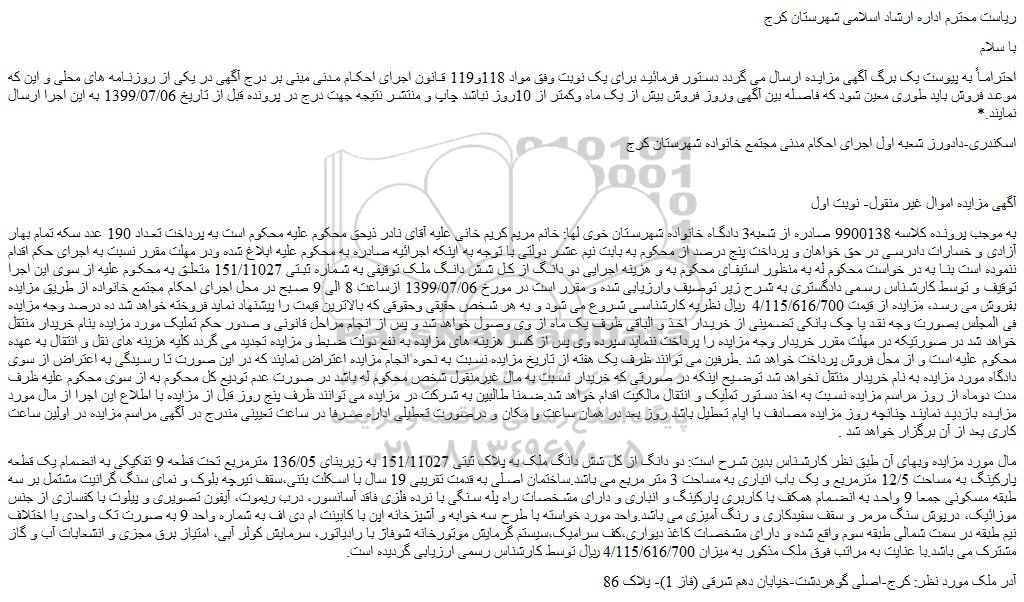 احتراماً به پیوست یک برگ آگهی مزایده ارسال می گردد دستور فرمائید برای یک نوبت وفق مواد 118و119 قانون اجرای احکام مدنی مبنی بر درج آگهی در یکی از روزنامه های محلی و این که موعد فروش باید طوری معین شود که فاصله بین آگهی وروز فروش بیش از یک ماه وکمتر از 10روز نباشد چاپ و منتشر نتیجه جهت درج در پرونده قبل از تاریخ 1399/07/06 به این اجرا ارسال نمایند.*
