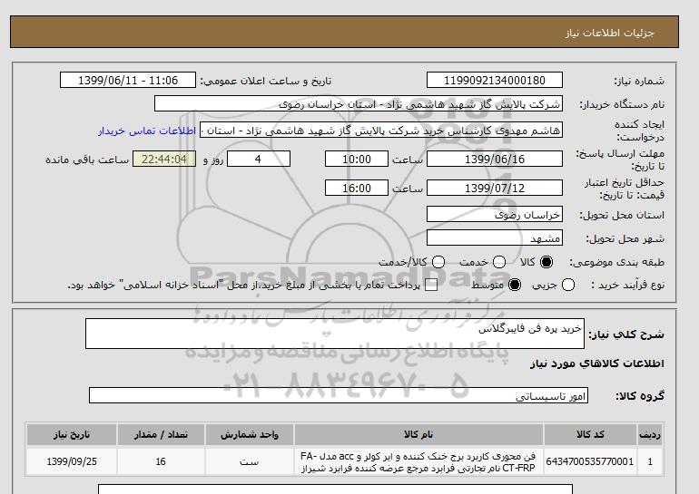 نام دستگاه خریدار:شرکت پالایش گاز شهید هاشمی نژاد - استان خراسان رضوی