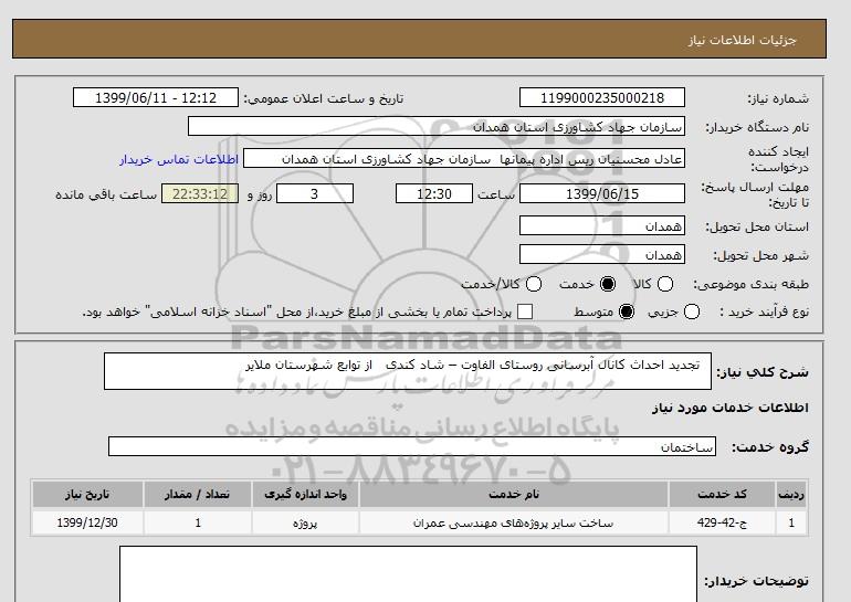 شرح کلی نیاز: تجدید احداث کانال آبرسانی روستای الفاوت – شاد کندی از توابع شهرستان ملایر