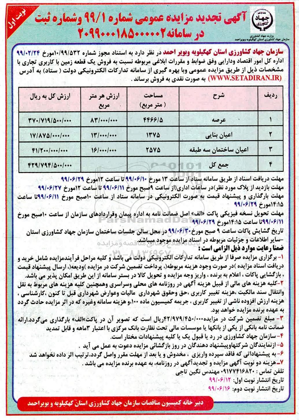 مزایده عمومی مزایده تجدید فروش یک قطعه زمین با کاربری تجاری نوبت اول برگزار میگردد. از کلیه افراد متخصص و شرکتهای واجد شرایط دعوت به عمل میآید تا در این مزایده با کد خبرگزاری پارس نماد : 2667827 شرکت نمایند تاریخ شروع مزایده : 1399/06/12 مهلت شرکت در مزایده: تا پایان روز 1399/06/29 مکان برگزاری اموال واگذاری استانهای مزایدات استان کهگیلویه و بویراحمد و دستهبندیهای مربوط به این حراجی املاک و زمین میباشد.