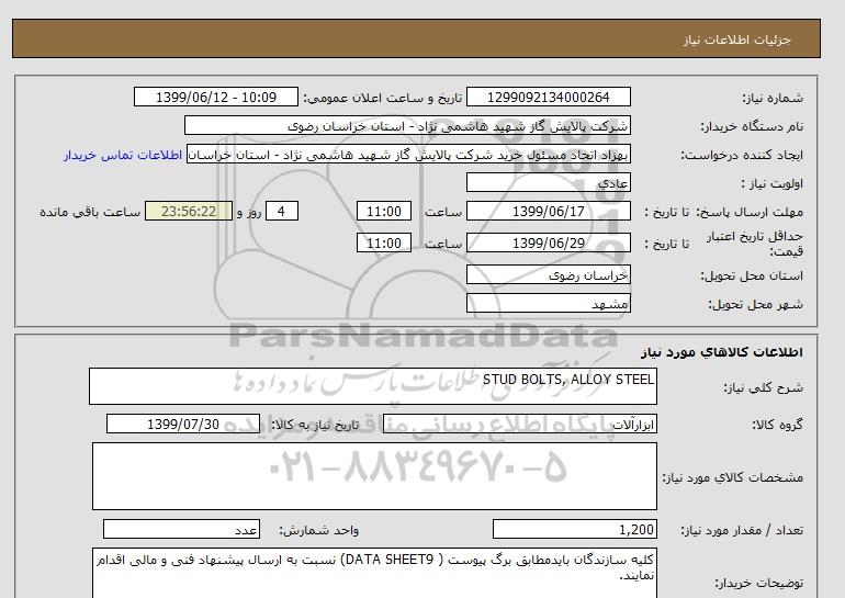 نام دستگاه خریدار:شرکت پالایش گاز شهید هاشمی نژاد - استان خراسان رضوی