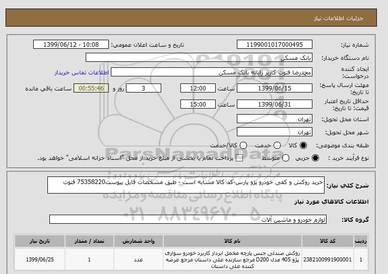 شرح کلی نیاز: خرید روکش و کفی خودرو پژو پارس-کد کالا مشابه است - طبق مشخصات فایل پیوست75358220 فتوت