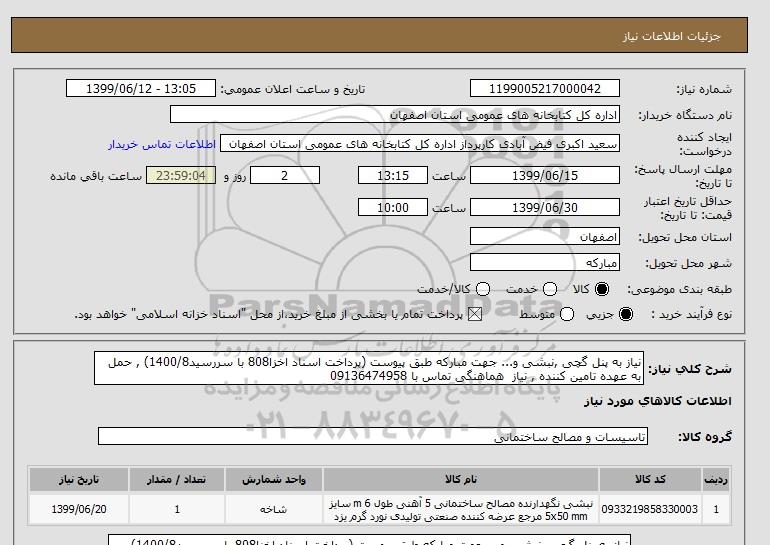شرح کلی نیاز: نیاز به پنل گچی ,نبشی و... جهت مبارکه طبق پیوست (پرداخت اسناد اخزا808 با سررسید1400/8) , حمل به عهده تامین کننده , نیاز هماهنگی تماس با 09136474958
