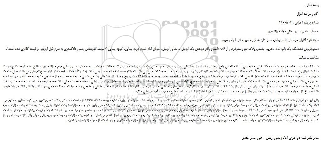ششدانگ یک باب خانه مخروبه بشماره پلاک ثبتی صفرفرعی از 1086اصلی واقع دربخش یک اردبیل به نشانی اردبیل، خیابان امام خمینی(ره)، یساول، کوچه یساول 2، به مالکیت وراث از جمله هاشم حسین خانی قوام فرزند فیروز، مطابق حدود اربعه مندرج در سند مالکیت ابرازی (مساحت 68.2متر)، عرصه ملک عملاً با توجه به نقشه برداری ملک و نظریه کارشناس شهرداری دارای مساحت حدود85مترمربع می باشد که با توجه به اینکه کوچه دسترسی ملک (مشترکاً با پلاک 1/1086) دارای طرح تعریض می باشد، طبق استعلام شهرداری بر عبوری دو ملک 1/1086و 1086به طول تقریبی 4متر خواهد بود. عرصه ملک در وضع موجود با پلاک 1086به ابعاد متوسط حدود17*10.23مترمربع و ملک از حدشمالی وشرقی وغربی مشرف به همسایه و ازحدجنوبی مشرف به همسایه و عبور به کوچه 6متری می باشد. اعیانی موجود مخروبه می باشد.کلیه هزینه های شهرداری ملک طی نامه واریز شده و هیچ گونه بدهی شهرداری وجود ندارد. لذا با در نظر گرفتن کلیه عوامل موثر در ارزیابی ازجمله موقعیت محلی ملک-حدود اربعه و مساحت عرصه قدمت وساخت اعیانی- وضعیت موجود ملک- وسایر عوامل موثر درارزیابی، ارزش کل ششدانگ ملک مذکور بدون درنظرگرفتن بدهی های احتمالی به سازمان ها و ارگانها، بانک ها و سایر اشخاص حقیقی و حقوقی و درصورتیکه هیچگونه منعی جهت نقل وانتقال نداشته و بلامعارض باشد به مبلغ کل چهار میلیارد و دویست و شصت میلیون ریال (چهارصد و بیست و شش میلیون تومان) بر اساس مساحت وضع موجود بر آورد وارزیابی میگردد.
