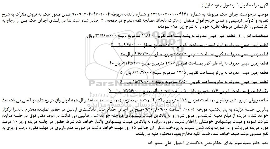 مشخصات اموال :1- قطعه زمین دیمی معروف به پشته بمساحت تقریبی 11840 مترمربع بمبلغ 31/968/000 ریال
