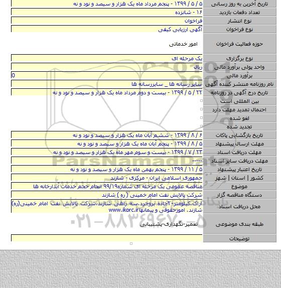 مناقصه عمومی یک مرحله ای شماره۹۹/۱۹ انجام حجم خدمات آبدارخانه ها