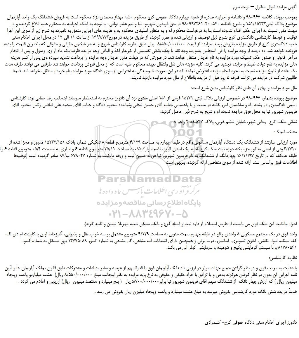 بموجب پرونده کلاسه 980467 و دادنامه و اجراییه صادره از شعبه چهارم دادگاه عمومی کرج محکوم  علیه مهناز محمدی نژاد محکوم است به فروش ششدانگ یک واحد آپارتمان  موضوع پلاک ثبتی151/15232 و بشرح دادنامه 9809972610400560 در حق فریدون شهریور نیا و نیم عشر دولتی.  با توجه به اینکه اجراییه به محکوم علیه ابلاغ گردیده و در مهلت مقرر نسبت به اجرای حکم اقدام ننموده است بنا به درخواست محکوم له و به منظور استیفای محکوم به و هزینه های اجرایی متعق به نامبرده به شرح زیر از سوی این اجرا توقیف و توسط کارشناسی دادگستری کرج بشرح ذیل توصیف و ارزیابی شده و مقرر گردیده از طریق مزایده در مورخ1399/7/3 از ساعت 11 الی 12 در محل اجرای احکام مدنی شعبه دادگستری کرج از طریق مزایده بفروش برسد. مزایده از قیمت 8/550/000/000  ریال طبق نظریه کارشناس شروع و به هر شخص حقیقی و حقوقی که بالاترین قیمت را بدهد فروخته خواهد شد. ده درصد از وجه مزایده را فی المجلس بصورت وجه نقد یا چک بانکی تضمینی از خریدار اخذ و الباقی وجه مزایده ظرف یک ماه از وی وصول و پس از انجام مراحل قانونی و صدور حکم تملیک مورد مزایده به نام خریدار منتقل خواهد شد. در صورتی که در مهلت مقرر خریدار وجه مزایده را پرداخت ننماید سپرده وی پس از کسر هزینه های مزایده به نفع دولت ضبط و مزایده تجدید می گردد. کلیه هزینه های نقل وانتقال بعهده محکوم علیه است که از محل فروش پرداخت خواهد شد طرفین می توانند ظرف مدت یک هفته از تاریخ مزایده نسبت به نحوه انجام مزایده اعتراض نمایند که در این صورت تا رسیدگی به اعتراض از سوی دادگاه مورد مزایده بنام خریدار منتقل نخواهد شد. ضمنا طالبین شرکت در مزایده می توانند ظرف 5 روز قبل از مزایده بااطلاع از مال مورد مزایده بازدید نمایند.