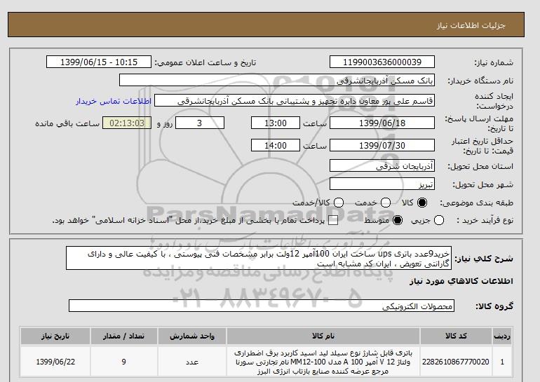 استعلام خرید9عدد باتری ups ساخت ایران 100آمپر 12ولت برابر مشخصات فنی پیوستی ، با کیفیت عالی و دارای گارانتی تعویض ، ایران کد مشابه است , استعلام خرید9عدد باتری ups ساخت ایران 100آمپر 12ولت برابر مشخصات فنی پیوستی ، با کیفیت عالی و دارای گارانتی تعویض ، ایران کد مشابه است