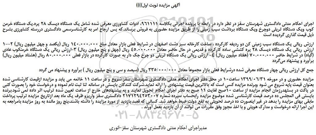 اجرای احکام مدنی دادگستری شهرستان سقز در نظر دارد در رابطه با پرونده اجرائی بکلاسه 961111، ادوات کشاورزی معرفی شده شامل یک دستگاه دیسک 28 پره.یک دستگاه خرمن کوب ویک دستگاه تریلی دوچرخ ویک دستگاه برداشت سیب زمینی را از طریق مزایده حضوری به فروش برساند.که پس ارجاع امر به کارشناسرسمی دادگستری دررسته کشاورزی بشرح ذیل قیمت گذاری گردیده است