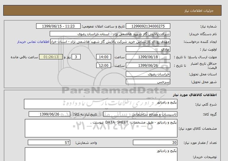 نام دستگاه خریدار:شرکت پالایش گاز شهید هاشمی نژاد - استان خراسان رضوی