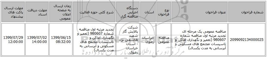 2099092134000025مناقصه عمومی یک مرحله ای تجدید مرتبه اول مناقصه شماره 980607 (تعمیر و نگهداری اماکن و تاسیسات مجتمع های مسکونی و آبرسانی به مدت یکسال) مناقصه عمومیخراسان رضویشرکت پالایش گاز شهید هاشمی نژاد - استان خراسان رضویتجدید مرتبه اول مناقصه شماره 980607 (تعمیر و نگهداری اماکن و تاسیسات مجتمع های مسکونی و آبرسانی به مدت یکسال)1399/06/15 08:32:001399/07/02 14:00:001399/07/29 12:00:00