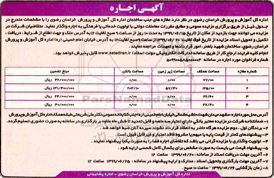 اداره کل آموزش و پرورش خراسان رضوی در نظر دارد مغازه های جنب ساختمان اداره کل آموزش و پرورش خراسان رضوی را با مشخصات مندرج در جدول ذیل از طریق برگزاری مزایده عمومی و مطابق مقررات معاملاتی دولتی را اولویت خدماتی یا فرهنگی به اجاره واگذار نماید. متقاضیان شرکت در مزایده می توانند جهت بازدید از مکان از تاریخ 99.6.15 به مدت 10 روز از ساعت 9 صبح الی 12 به ادرس ملک و جهت اطلاع از شرایط دریافت تکمیل و تحویل اسناد مزایده از تاریخ فوق تا 99.6.20 از ساعت 9 صبح تا 12 به آدرس خیابان امام خمینی اداره کل آموزش و پرورش خراسان رضوی ساختمان شهید باهنر اداره امور پشتیبانی مراجعه نمایند